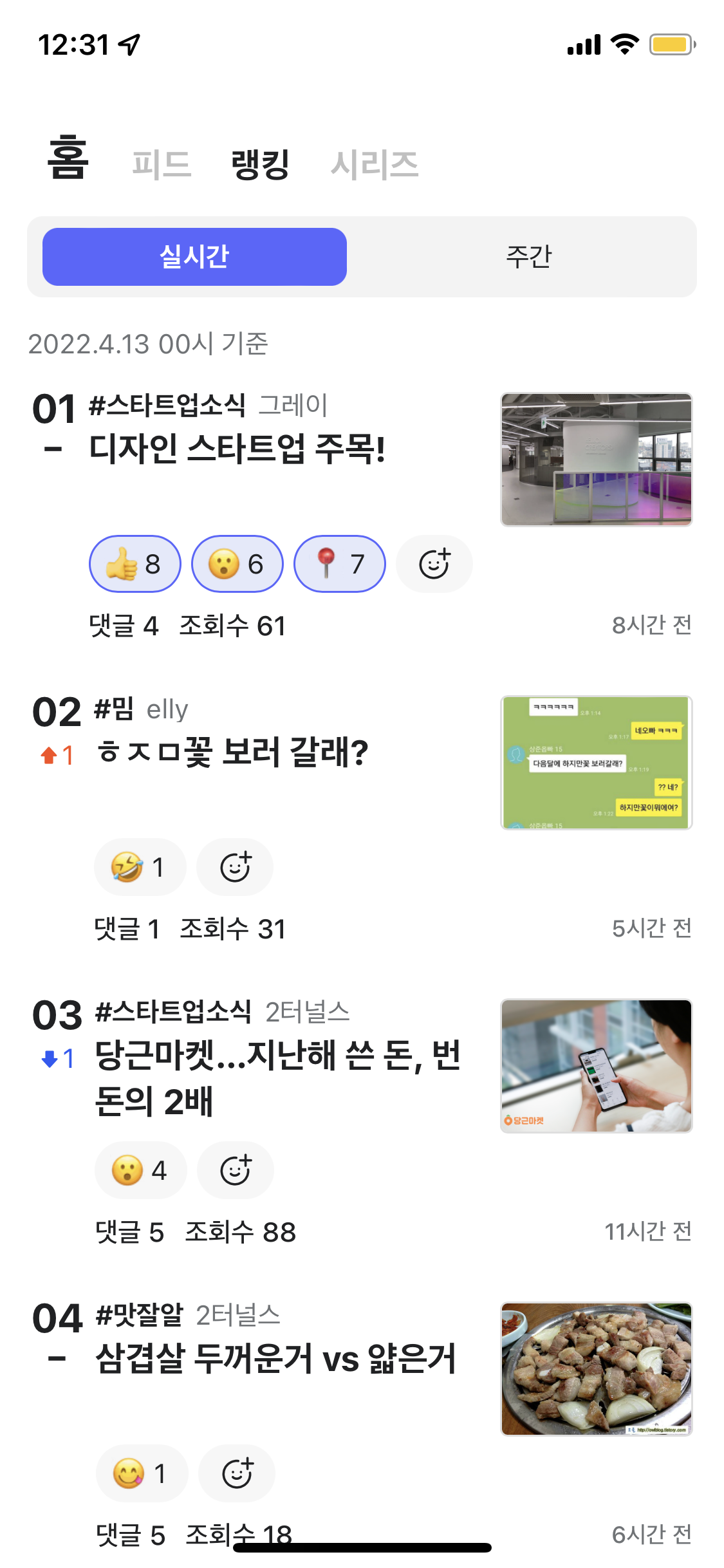 상단의 피드 / 랭킹 / 시리즈로