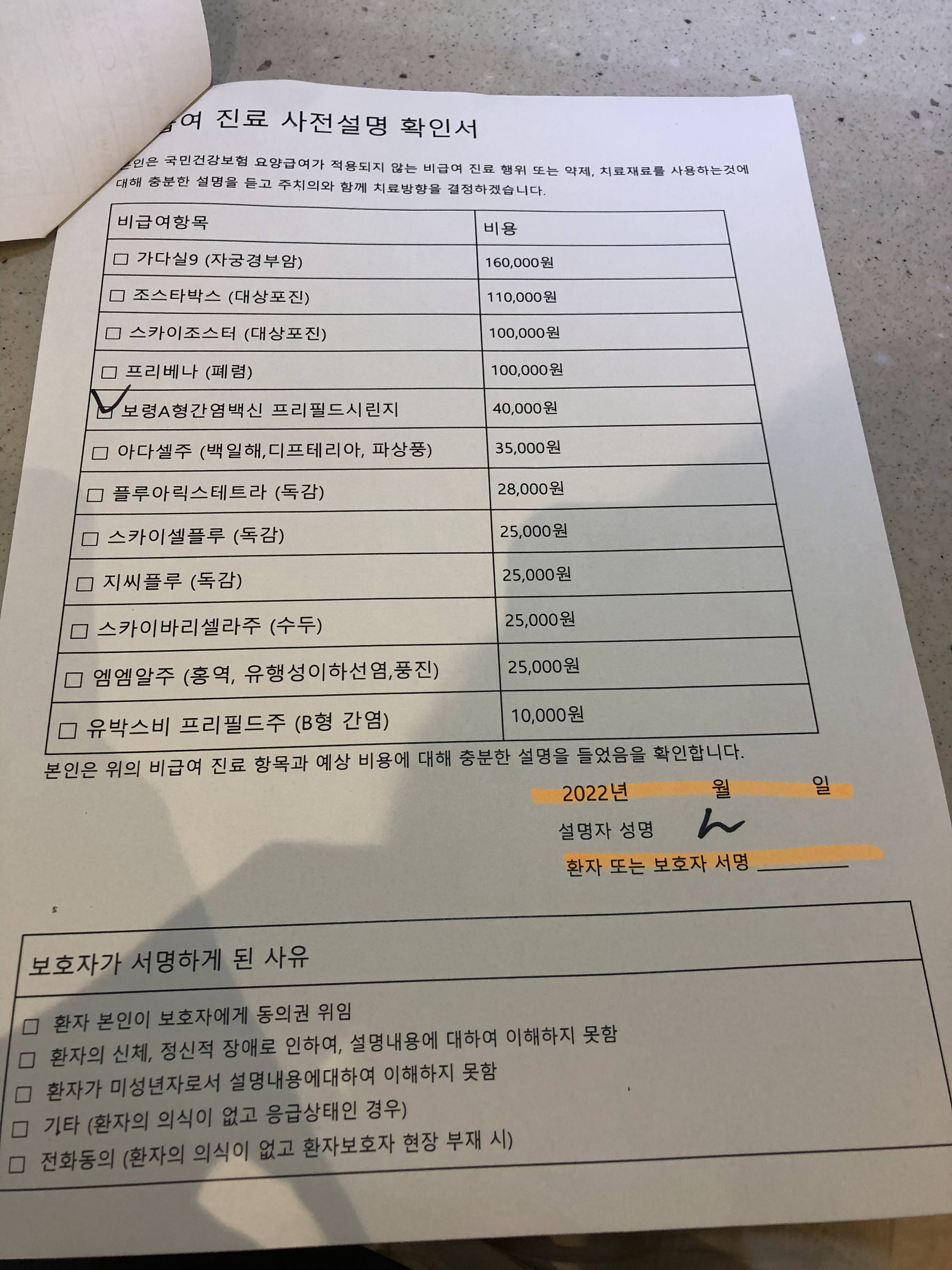 각종 예방접종 비용이 적혀있는데,