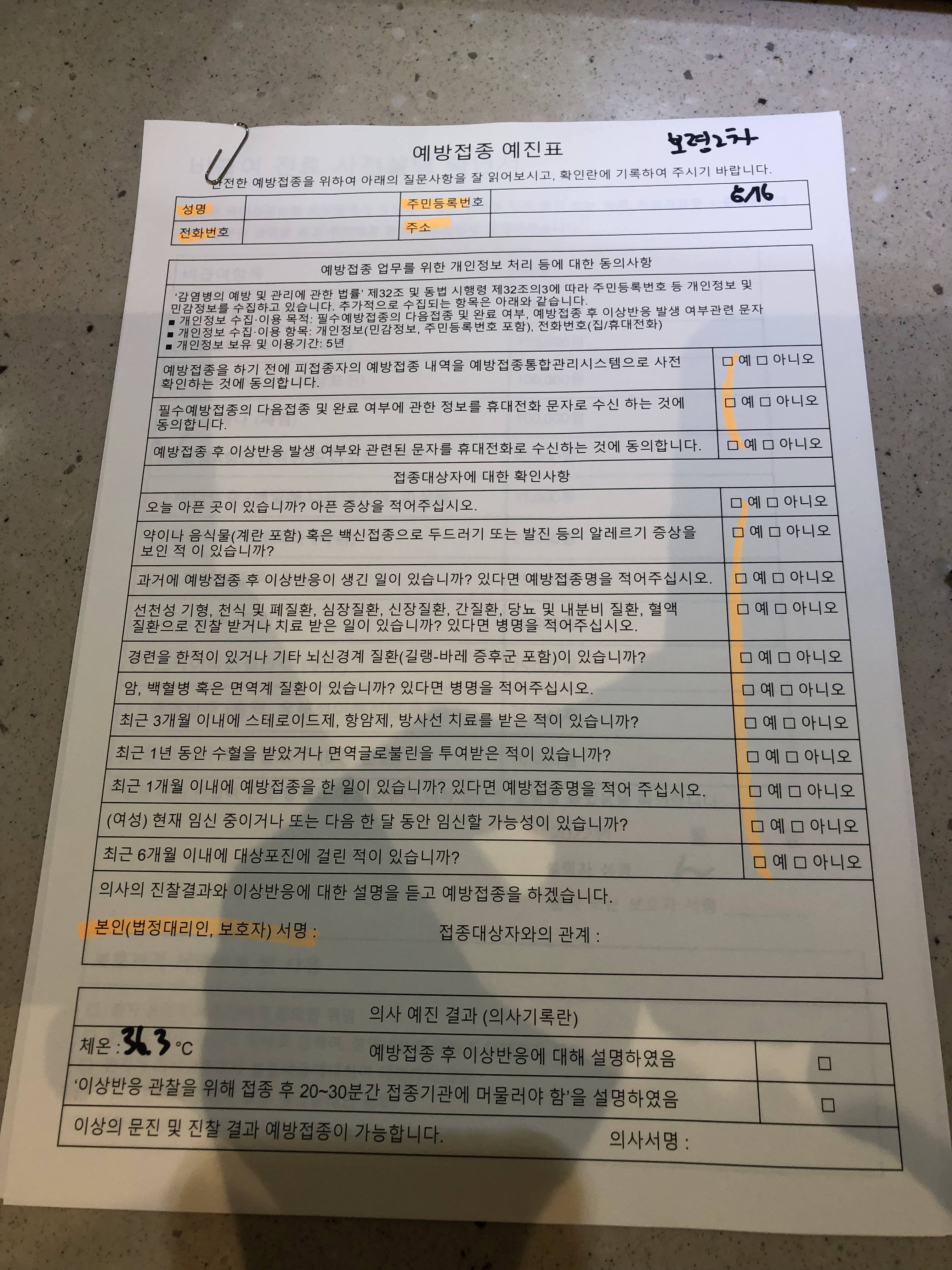 '예방접종 예진표'를 나눠주셔서