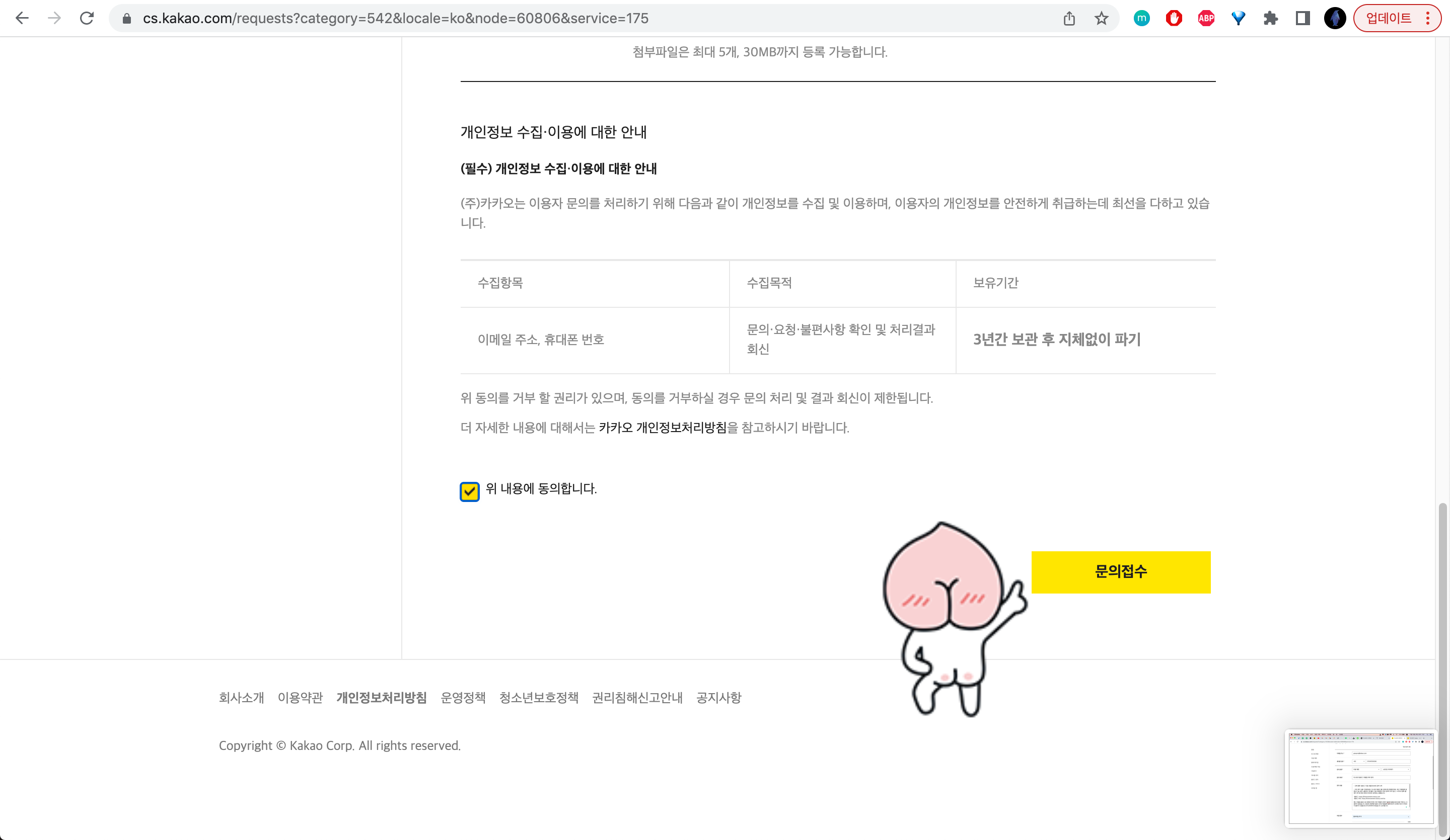 우측 하단의 <문의접수>를 클릭하면