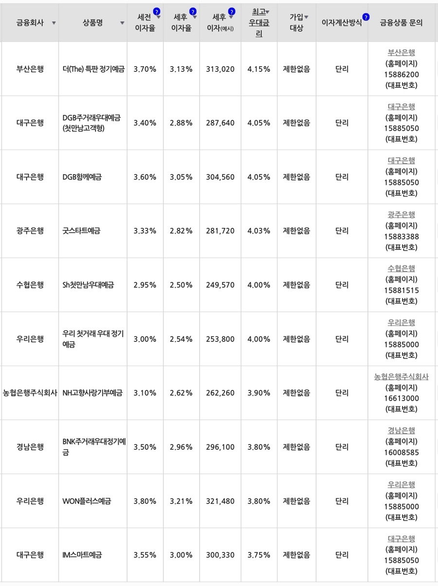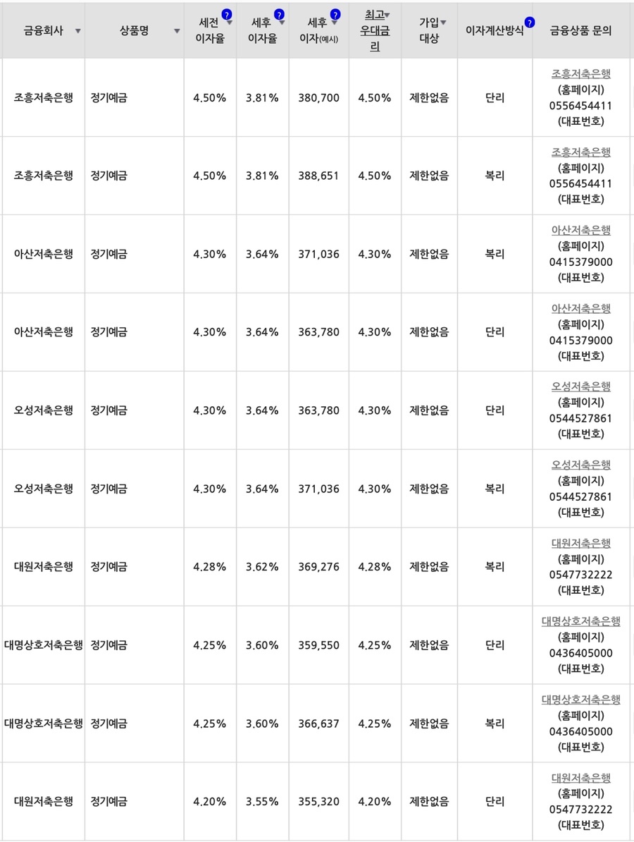 시중은행과 저축은행 각각 금리가 높은 TOP 10을 표로 작성하고, 대망의 1위 상품들은 자세히 설명해 뒀으니 안전자산을 선호하시는 분들은 현명하게 잘 활용해보시면 좋을 것 같습니다.