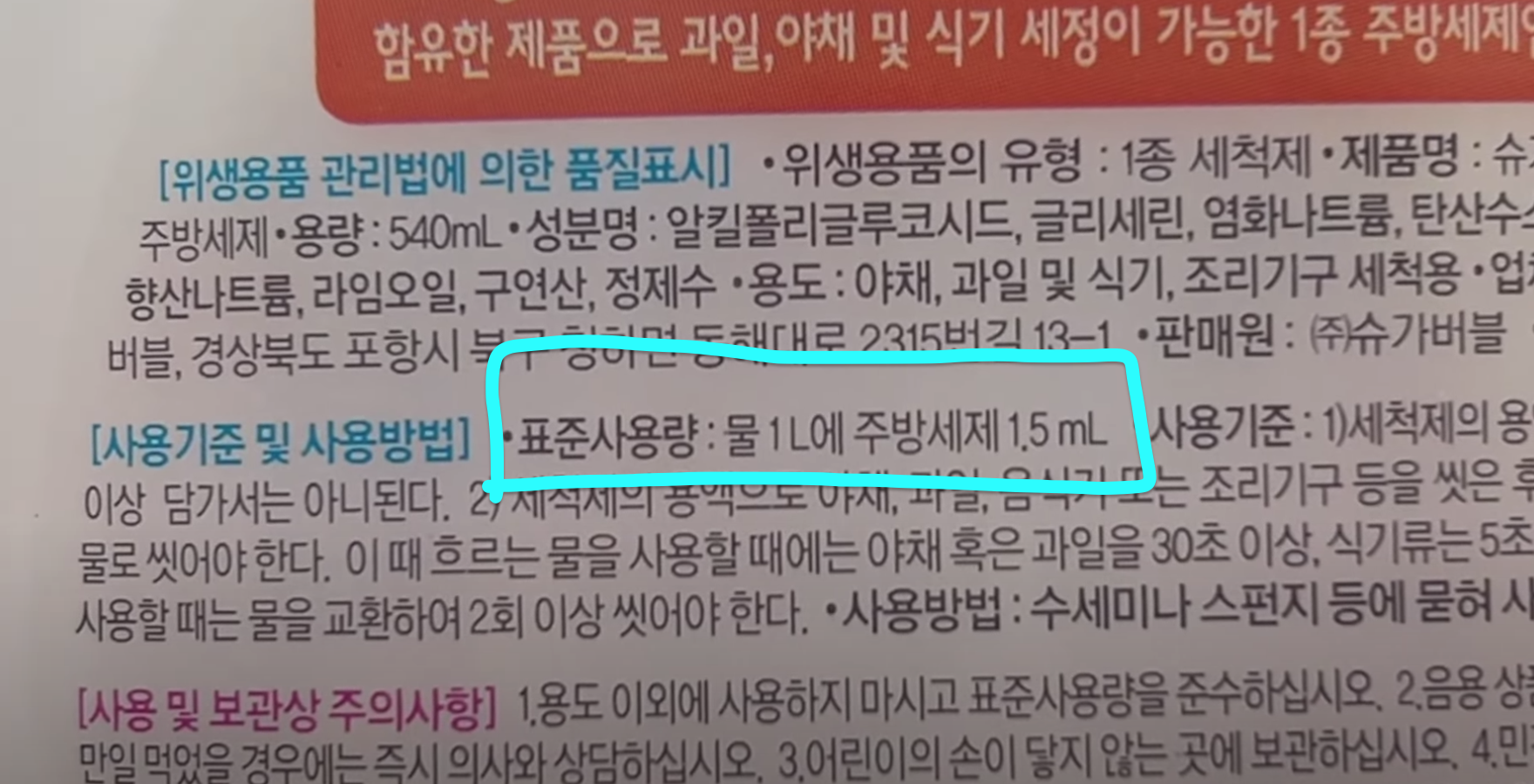 실제 주방세제 업체에서도 표준사용량을 물 1L에 주방세제 1.5mL로 권장하고 있어요. 직접 수세미에 짜서 사용하지 말고 희석해서 사용하라는 말입니다.