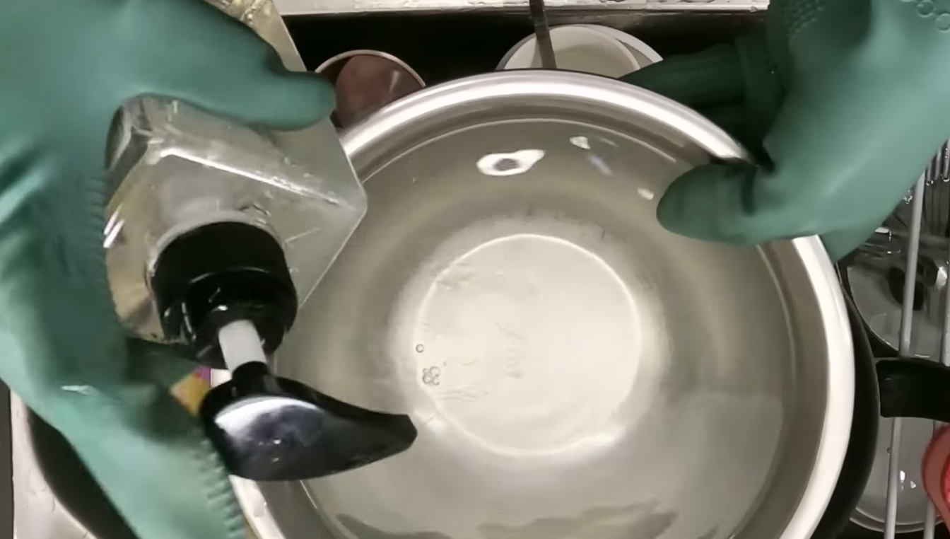 1. 주방세제 업체의 사용권장량에 맞게 물 1L에 주방세제 1.5mL를 넣고 희석해 줍니다. 쉽게 생각하면 스테인리스 그릇에 물을 담고 주방세제 1~2방울을 넣어준 후 휘이~휘이~ 섞어주면 됩니다.