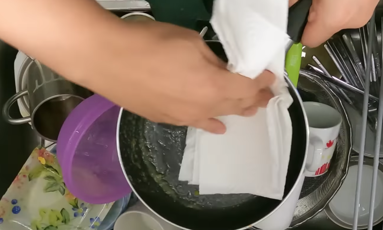 3. 기름기가 많은 프라이팬의 경우, 키친타월로 기름기를 깨끗이 제거해 줍니다.