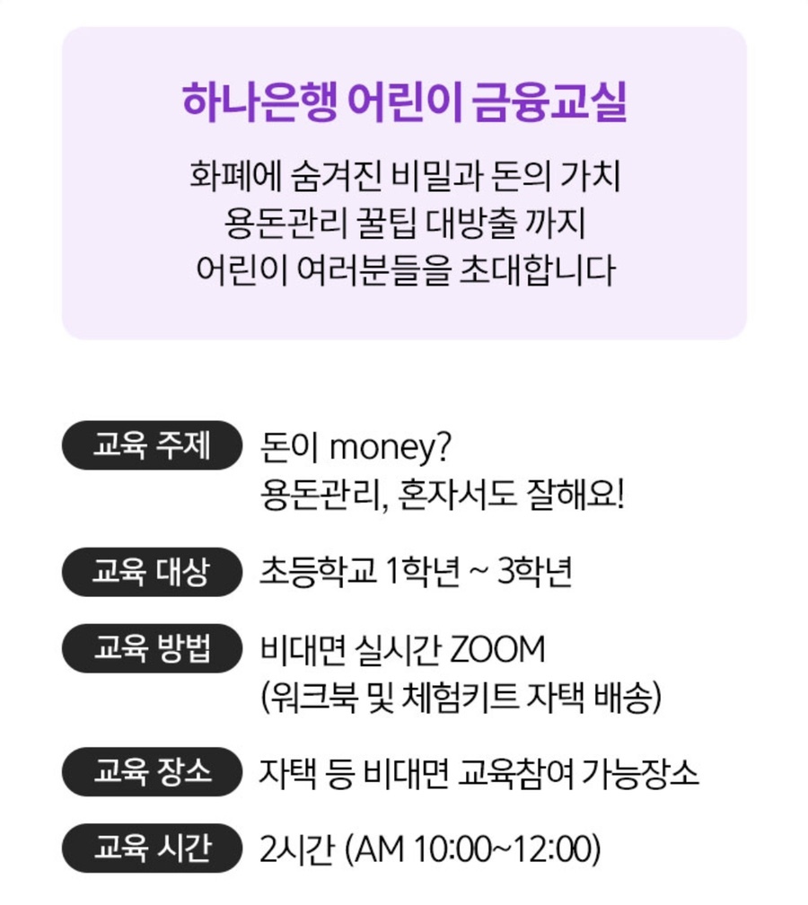 하나은행에서 초등학교 저학년을 대상으로 비대면(줌 ZOOM) 금융교육을 진행합니다.