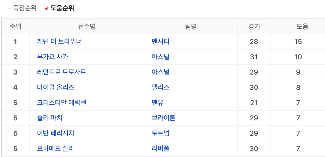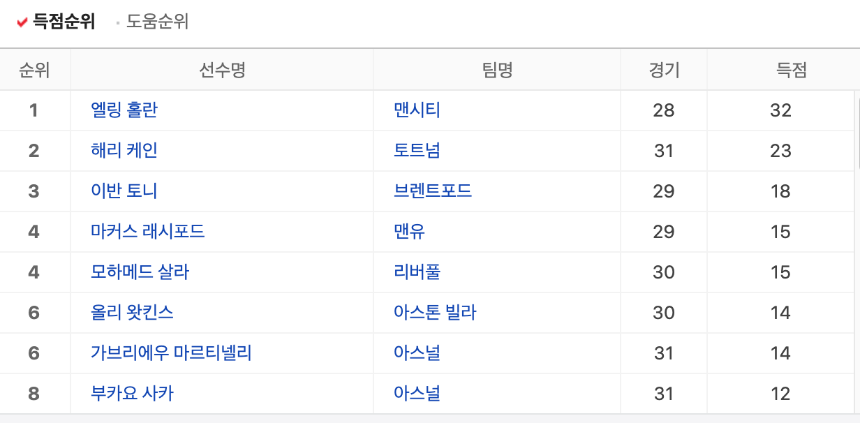 프리미어리그 선수들의 득점과 도움 순위를 체크하는 것도 놓쳐서는 안되겠죠?