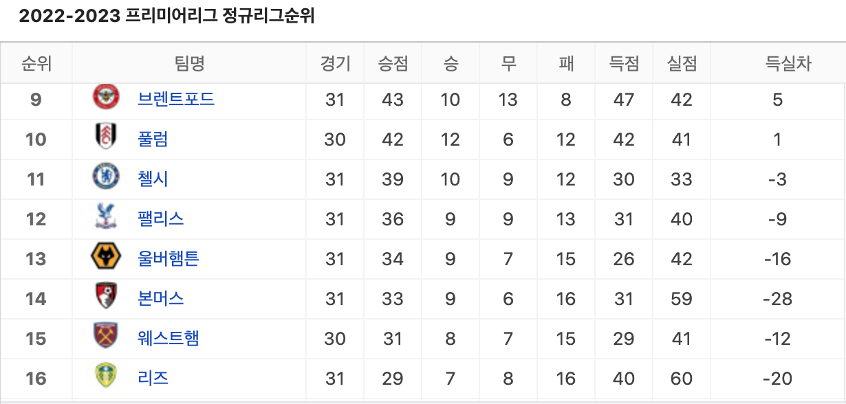 잉글랜드 프리미어리그의 찐팬이라면 구단순위도 체크해야 하는데요. 4위까지 주어지는 챔스 싸움과 강등권 싸움이 아주 치열하게 진행되고 있어서 보는 재미가 쏠쏠합니다.