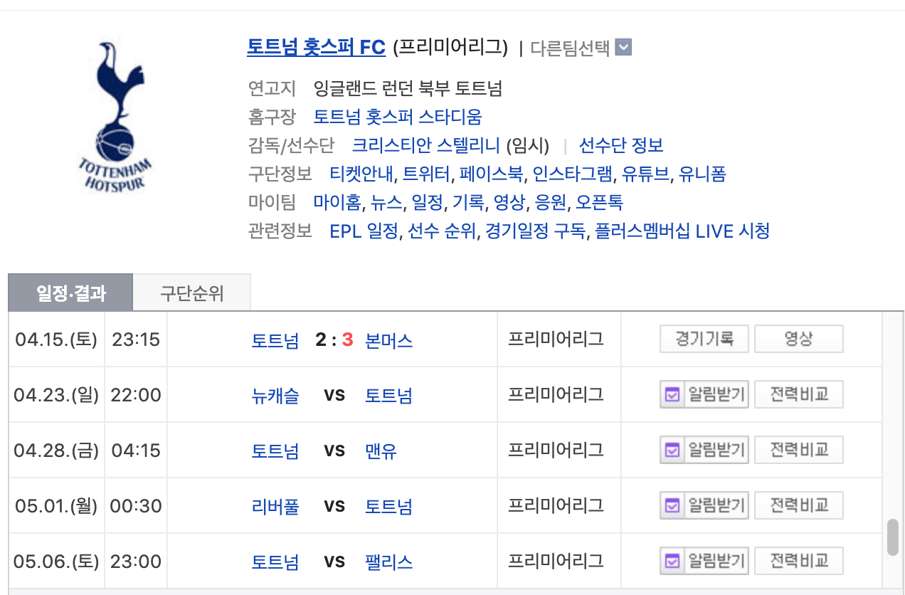 토트넘 핫스퍼의 실시간 경기 결과와 앞으로의 경기 일정까지 가장 쉽고 빠르게 확인할 수 있는 방법입니다. 경기 기록과 영상 확인도 꼼꼼하게 챙겨보세요!