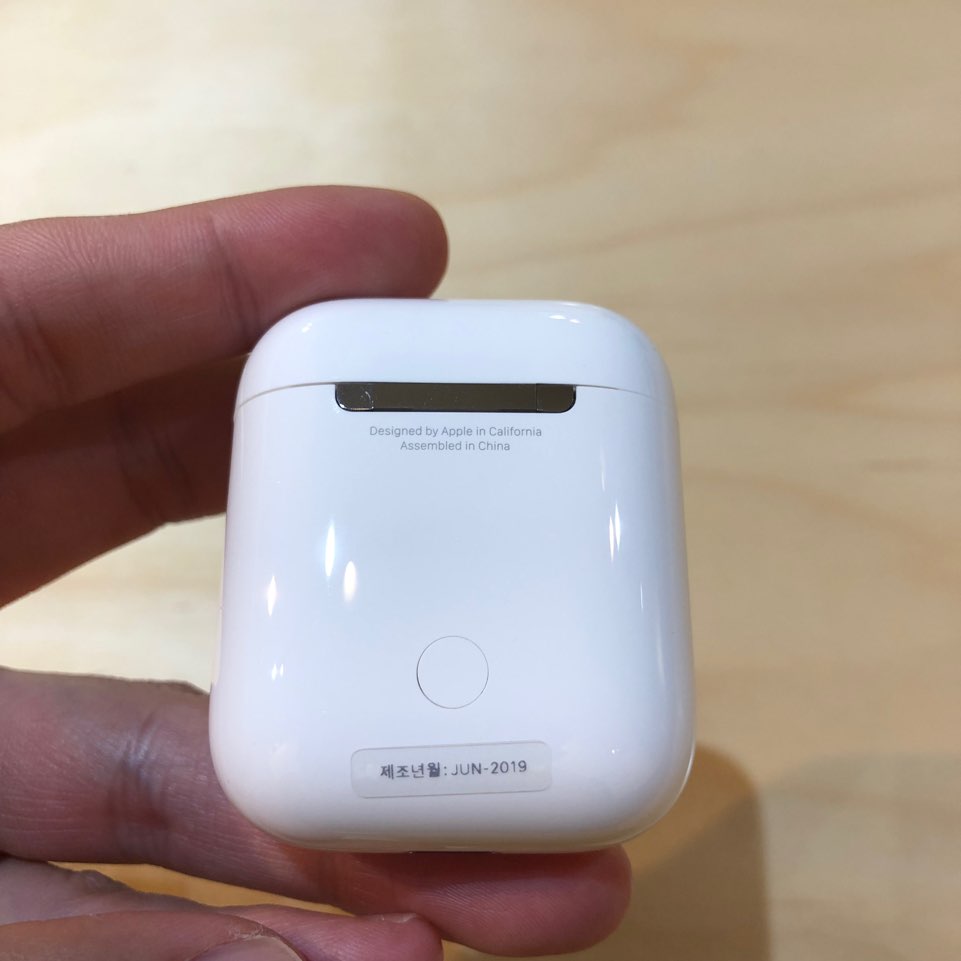 충전케이스에서 에어팟을 빼서 보니 더 귀엽고 앙증맞네요. 귓속에 넣어보니 수제화처럼 딱 맞습니다. (충전케이스 뒷면에는 친절하게 2019년 6월에 제조했다는 표시가 있습니다.)